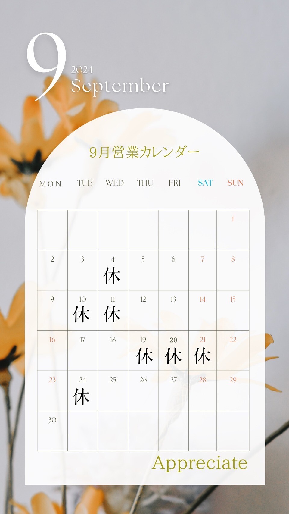 9月のお休みのお知らせです!